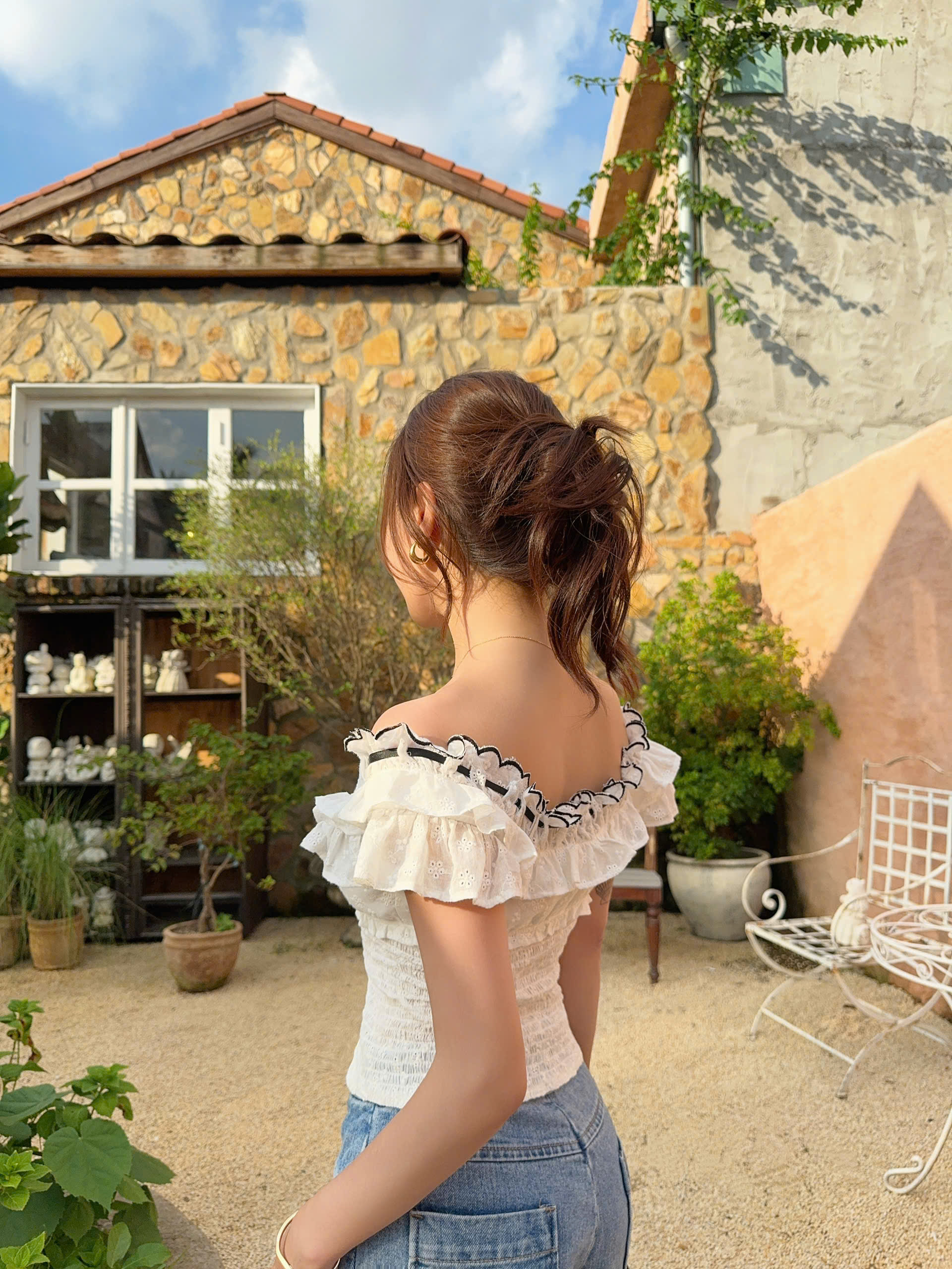 The Alice Top is a romantic and feminine mini top crafted in crisp white broderie fabric, accented with charming black ribbon details. Featuring elastic smocking for a comfortable fit and delicate embroidery along the neckline, this top blends vintage sweetness with everyday wearability—perfect for pairing with denim or skirts in any season.