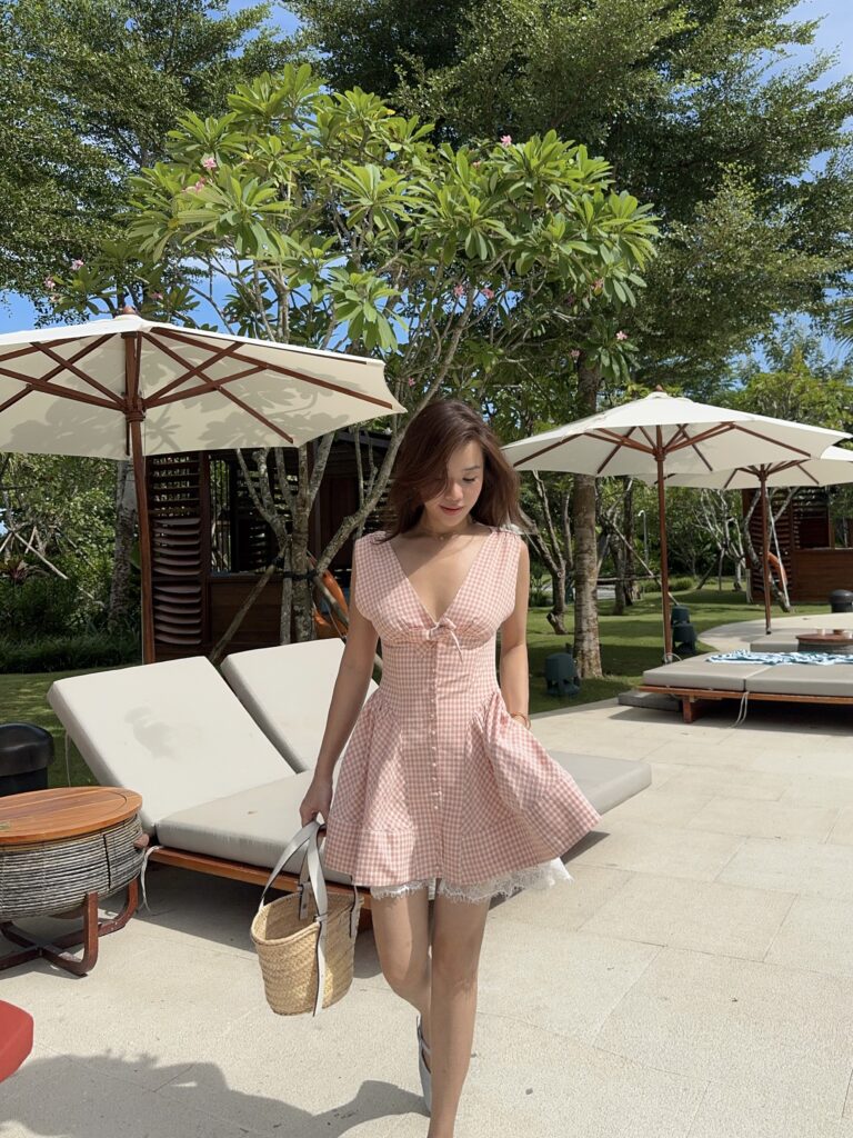 • Model is 156cm tall and weighs 45kg. Her measurements are 80 – 62 – 90 cm, wearing size S.