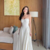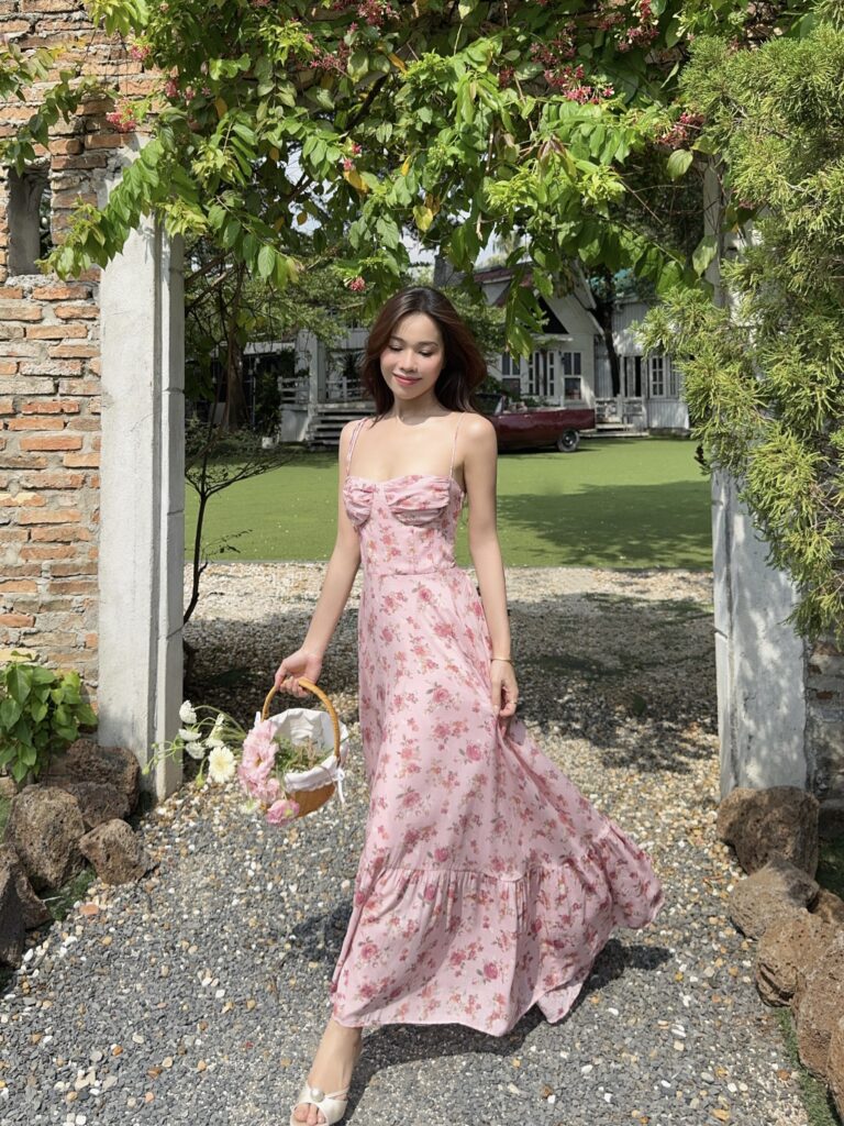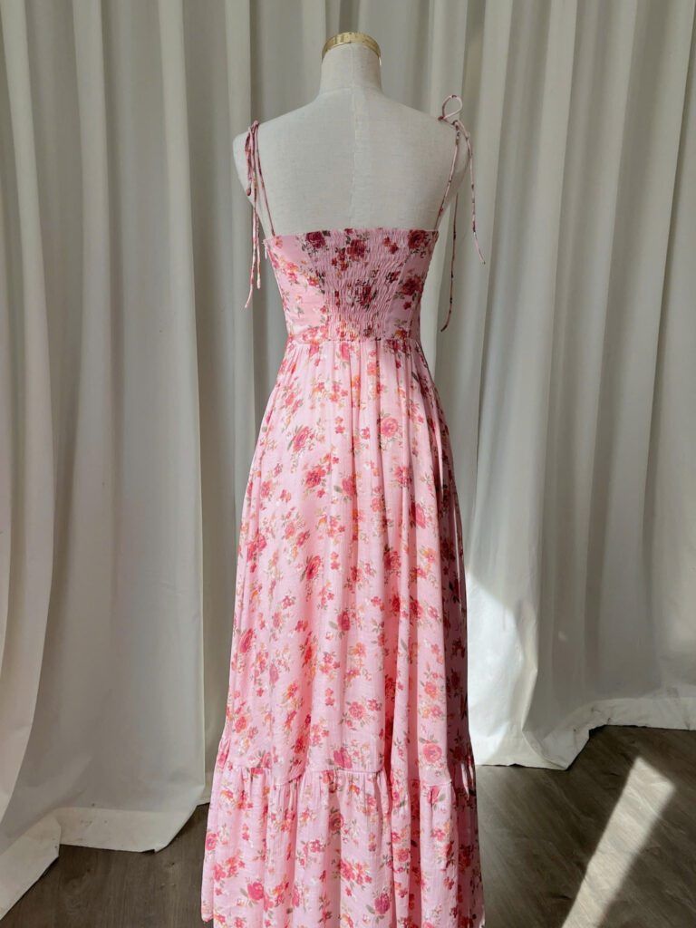 The Merlisa Dress – Pink Floral is a romantic maxi corset dress crafted from a breezy linen–silk blend. With self‑tie shoulder straps and a softly draped skirt, it brings an elegant, feminine look that works for daytime events, garden parties, and summer dates.
