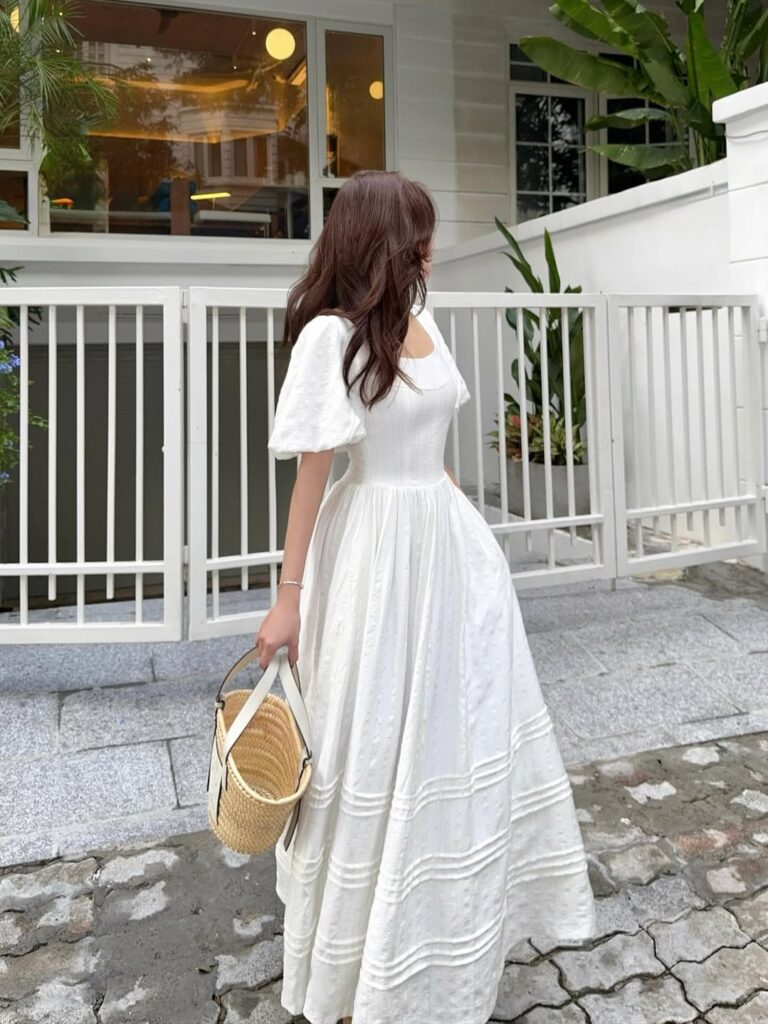 Effortlessly elegant and versatile, the Monica Dress in white is a flattering maxi-length piece designed for everyday grace. Made from structured textured fabric with subtle glittery pinstripes, this dress transitions seamlessly from a chic daytime look to an understated evening outfit.