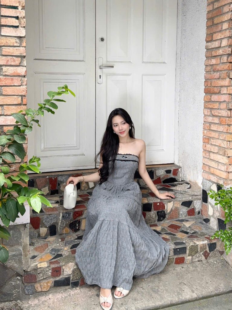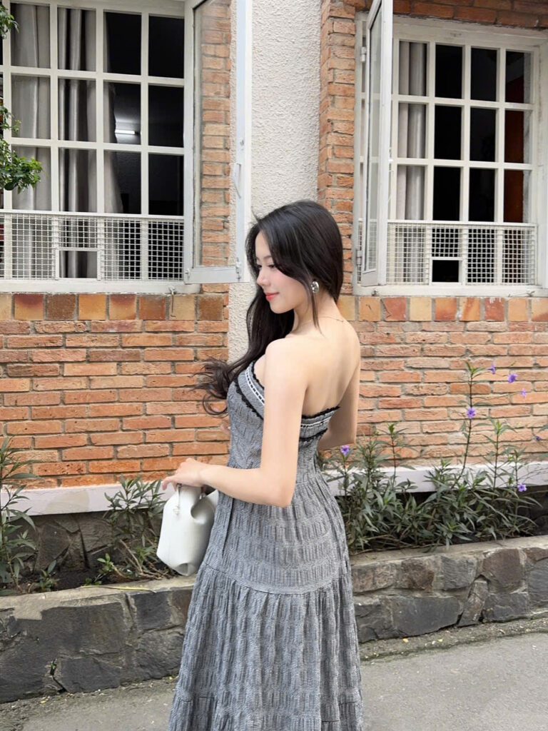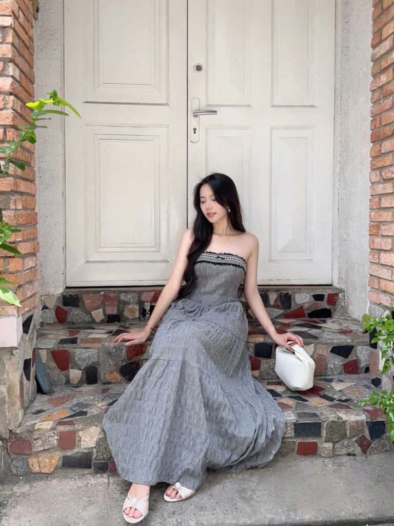 The Oriana Dress in dark grey gingham is a timeless midi silhouette with romantic lace trim and ribbon detail at the bust. Crafted from soft shirred cotton blend fabric, it offers a breathable yet slightly elastic fit for comfort and ease of movement. Perfect for picnics, weekend strolls, and charming daytime occasions.