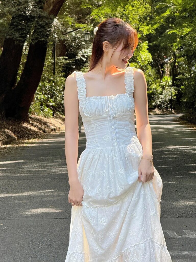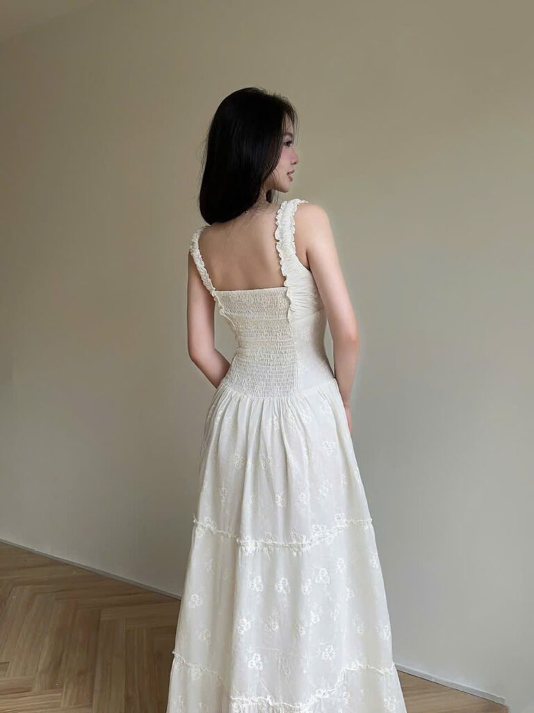 The Pomelo Dress is a flowy summer midi dress designed for comfort and volume. With gathered tiers, adjustable bust ties, and elastic smocking at the back, this style offers easy elegance with a subtle romantic touch. Ideal for sunny days, picnics, and feminine everyday looks.