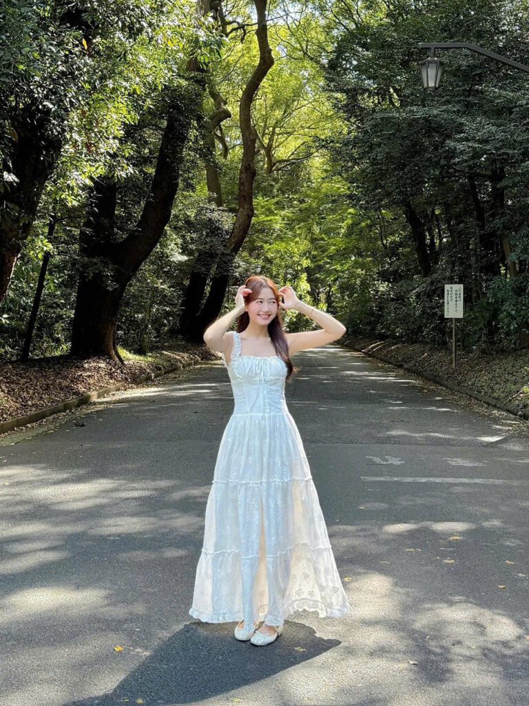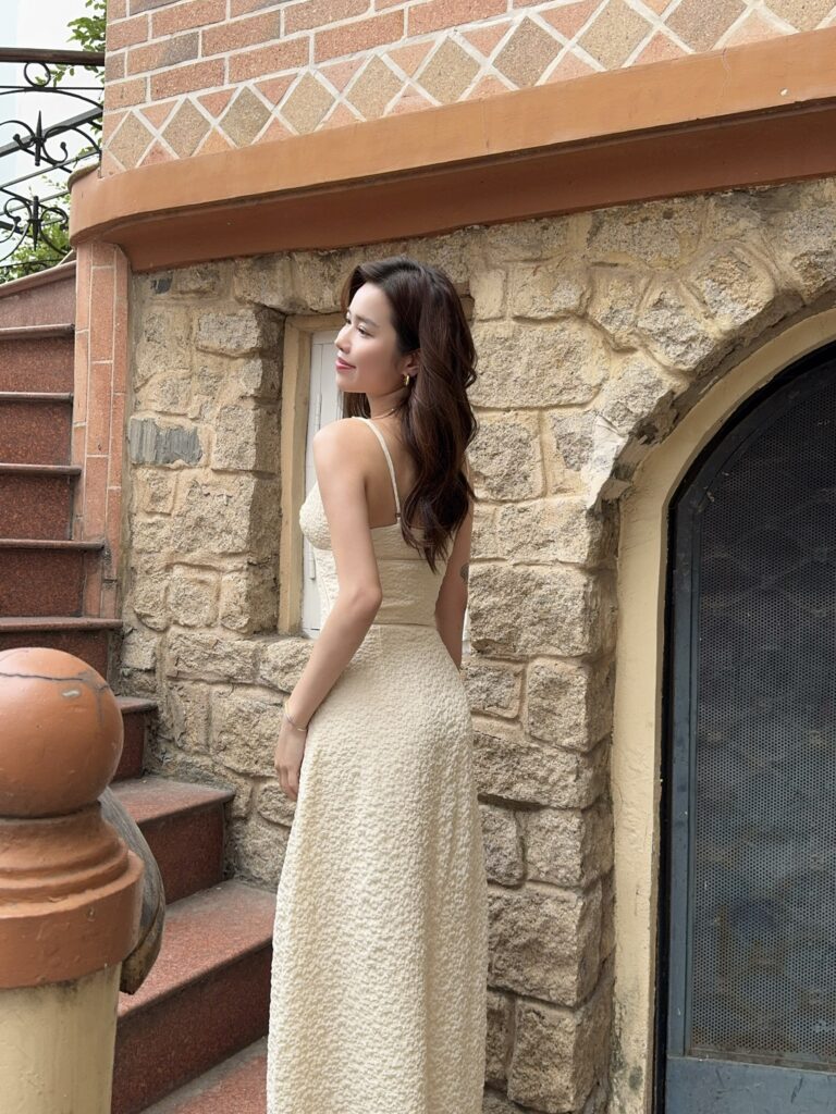 • Model is 156cm tall and weighs 45kg. Her measurements are 80 – 62 – 90 cm, wearing size S.