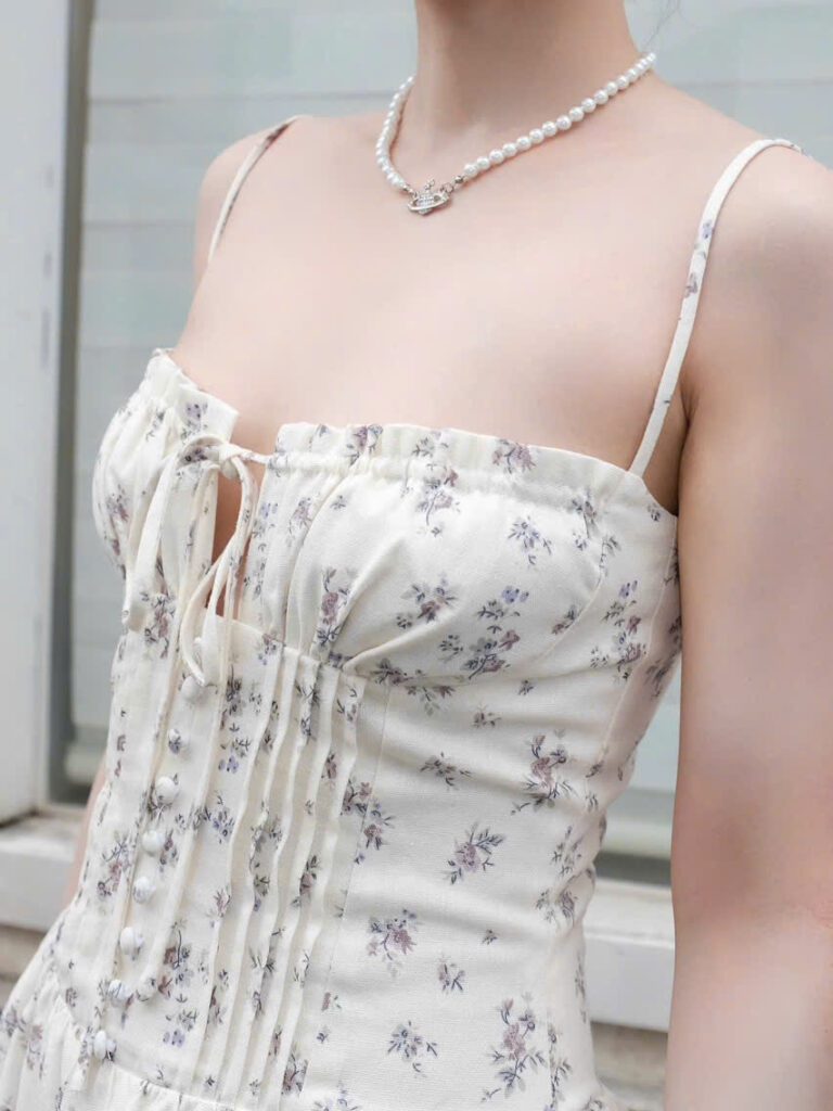 • Decorative fabric-covered buttons at the waist